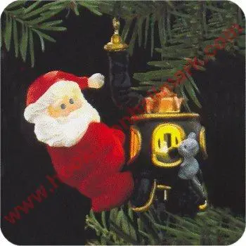 Santa warms up in his flocked PJ’s with a mouse friend standing by.