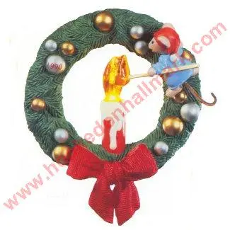 Chris lights the candle inside a lovely green wreath decorated with gold ball ornaments.