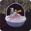 Within this ornament reminiscent of a snow globe Santa flies over rooftops on Christmas Eve.