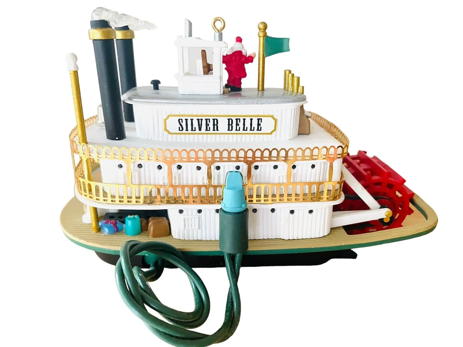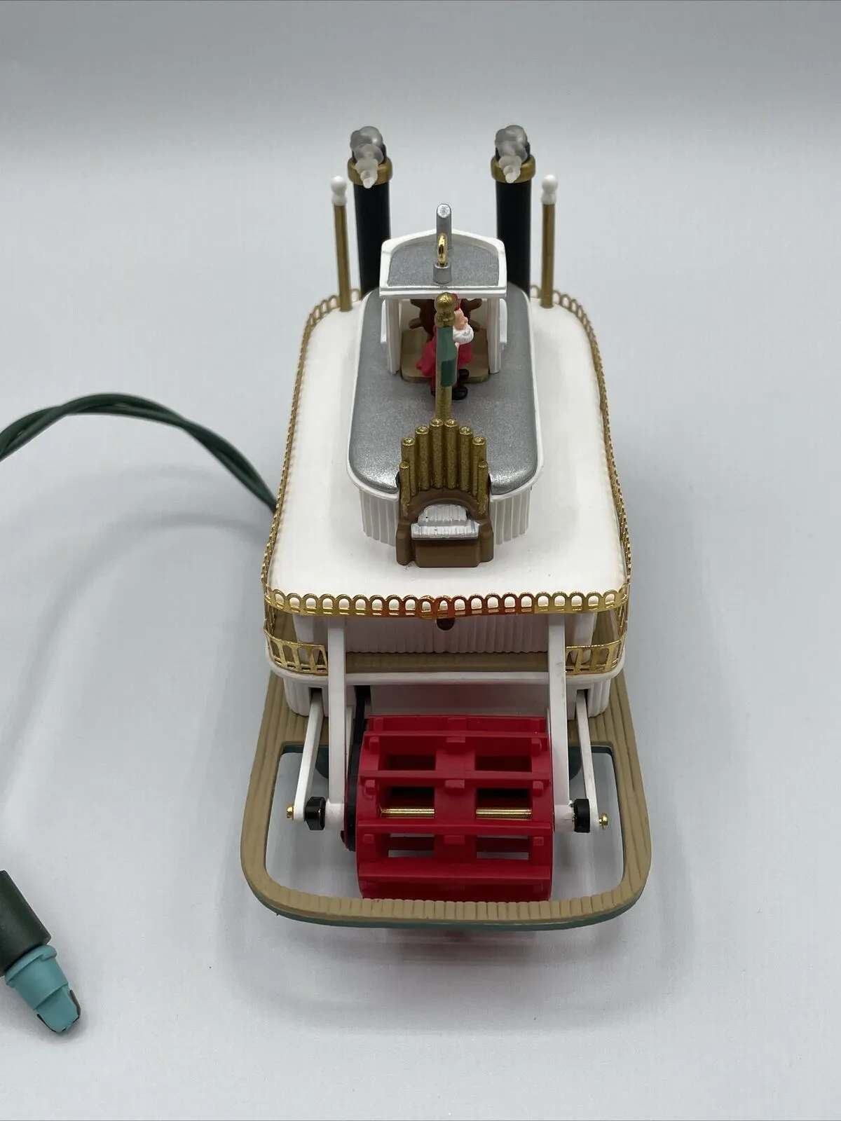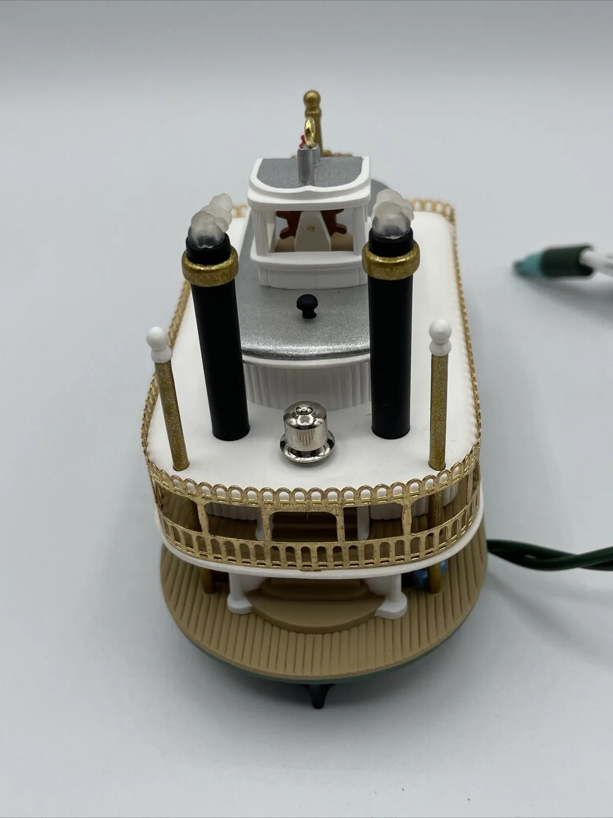 Paddle wheel turns, running lights operate. Light flickers above the steamboat’s chimneys and portholes glow constantly.