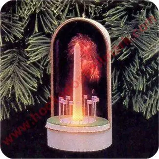 Light at base of monument glows softly; Lights flash across the sky accompanied by the sounds of real fireworks.