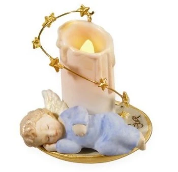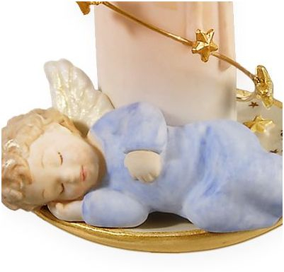 An adorable baby angels sleeps peacefully on a candlestick. On ornament: “Sleep in heavenly peace.” Attaches to your light string for an optional lighting effect.