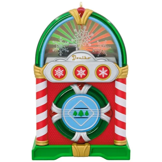 Rock all the way around the Christmas tree and back again with this funjukebox ornament. Just push a button and watch it come alive with lights