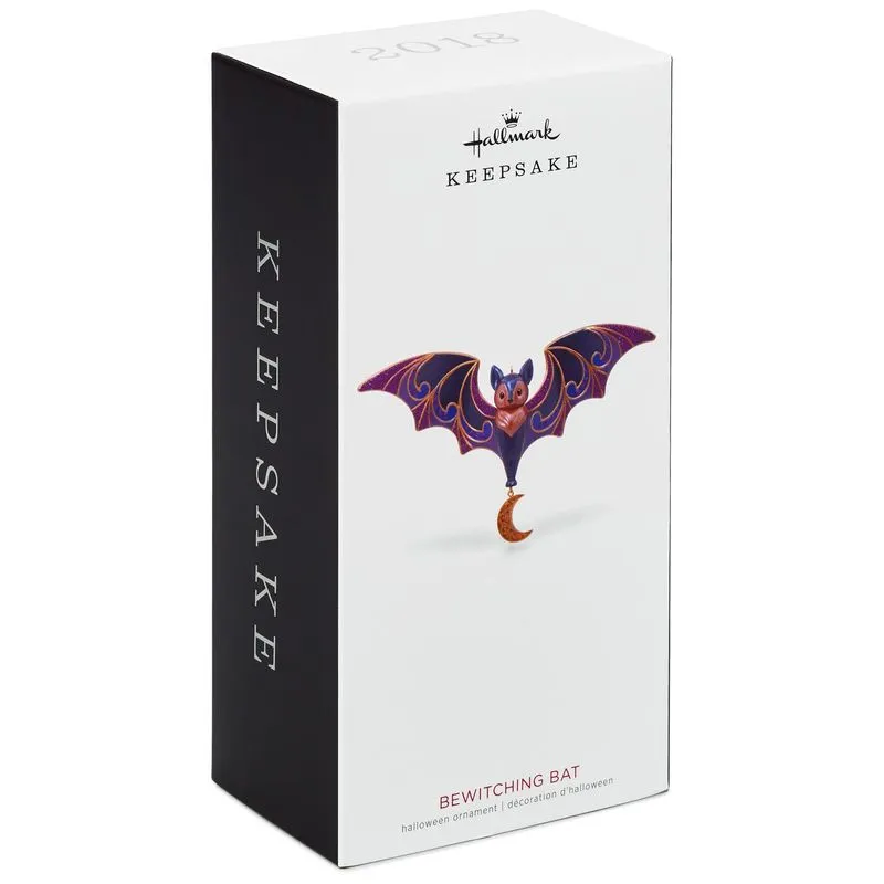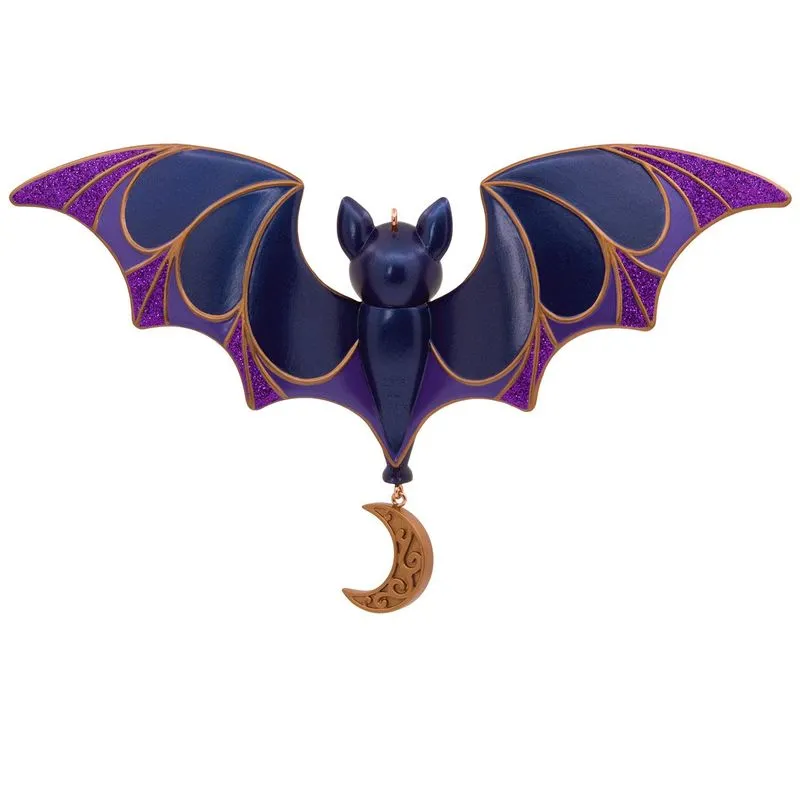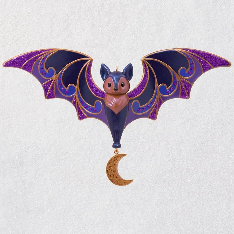 Let your imagination take flight when you display this hauntingly lovely bat Halloween ornament. With an ornate design in purple, royal blue and bronze with glitter accents, this nocturnal creature is a bewitching addition to your fall decorating. A dangling crescent moon charm lends the perfect finishing touch.