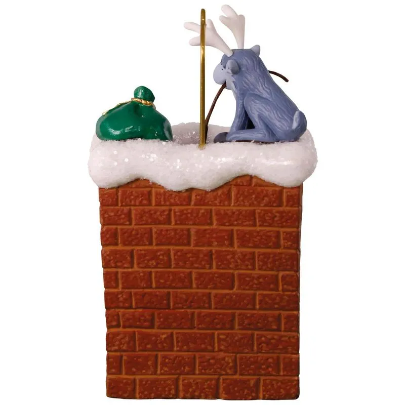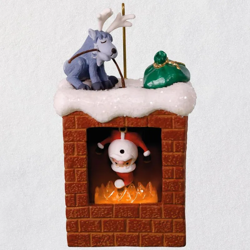 Santa had better use some of his special magic fast to put out the roaring fire in this fireplace! And hopefully his trusty reindeer, perched on the sparkling, snow-covered roof, has a good grip. Glowing flames and the song “Ring of Fire” add to the humor of this playful Christmas tree ornament. Press the button to see the fire glow and hear part of the country classic performed by Johnny Cash.
