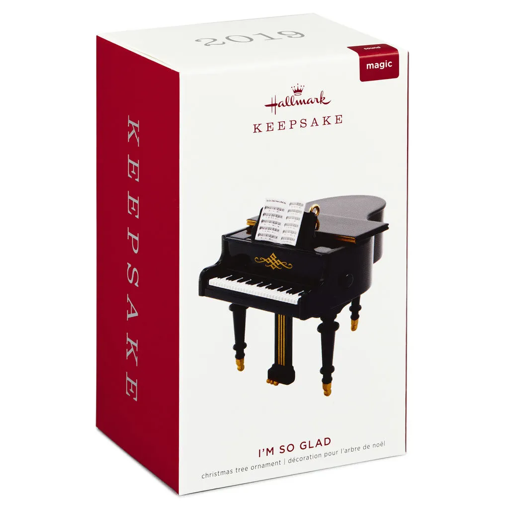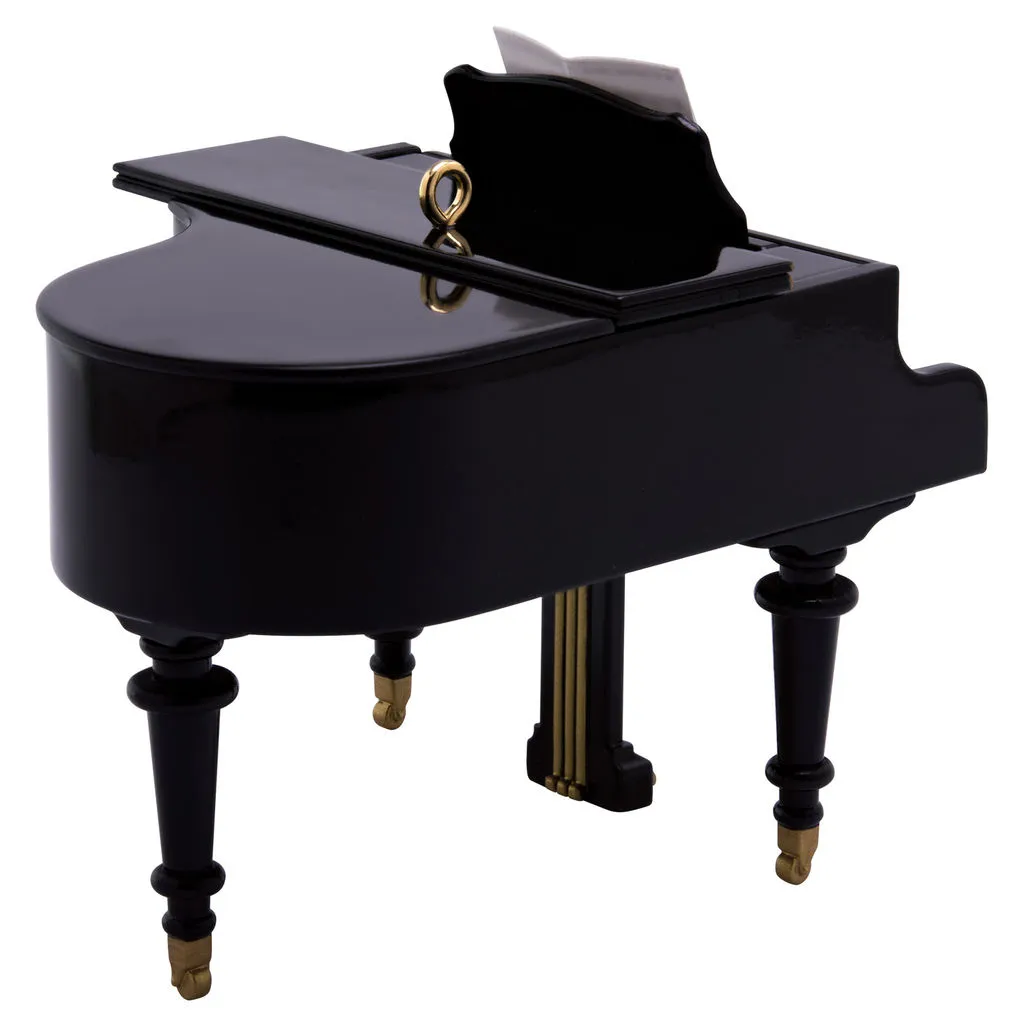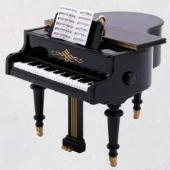 Add the sounds of the season to your tree with this musical Christmas ornament. The shiny black baby grand piano is accented with gold paint and includes printed sheet music for the song selection, “I’m So Glad Jesus Lifted Me.” Just press a button to hear a gospel choir performance of this inspiring hymn. Sound feature is battery-operated.
