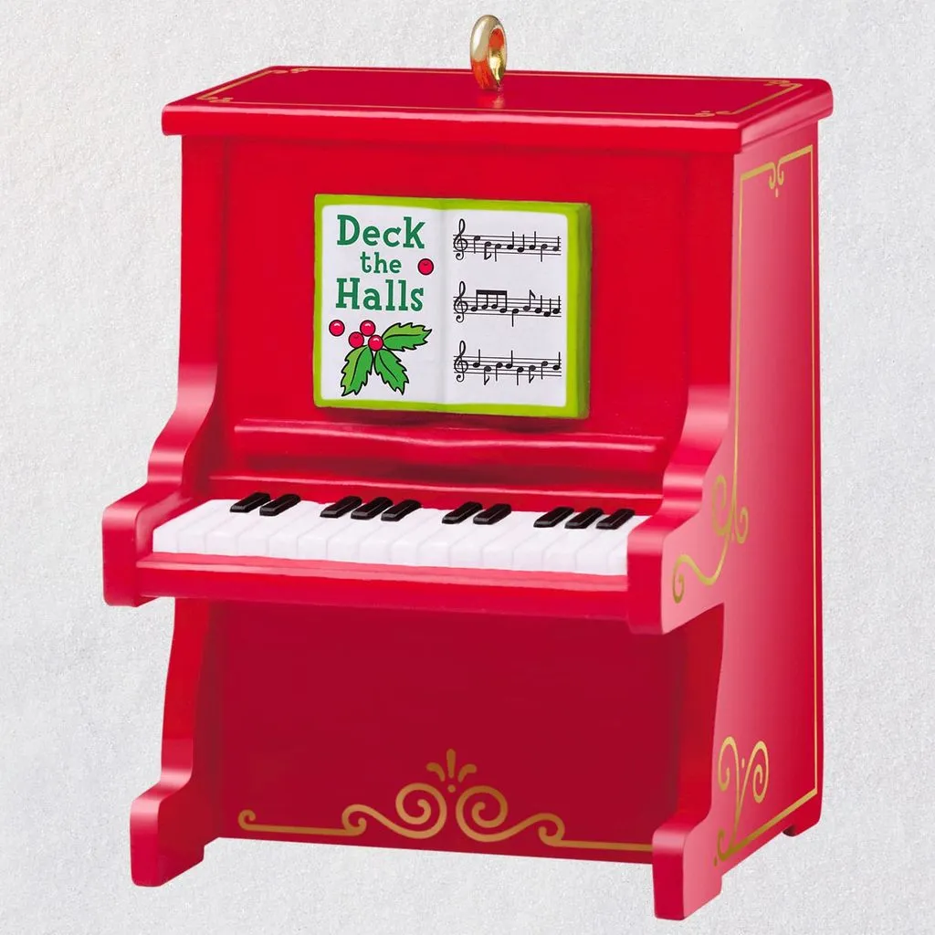 Hit the right key this holiday season with our festive, miniature red piano Christmas tree ornament. Press the button on the sheet music to hear the ornament play an instrumental version of “Deck the Halls.” Sound feature is battery-operated.
