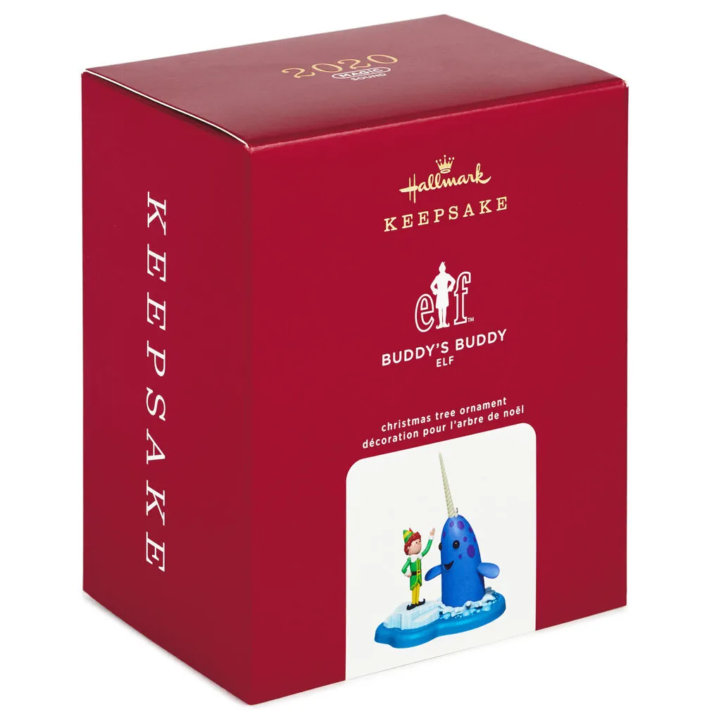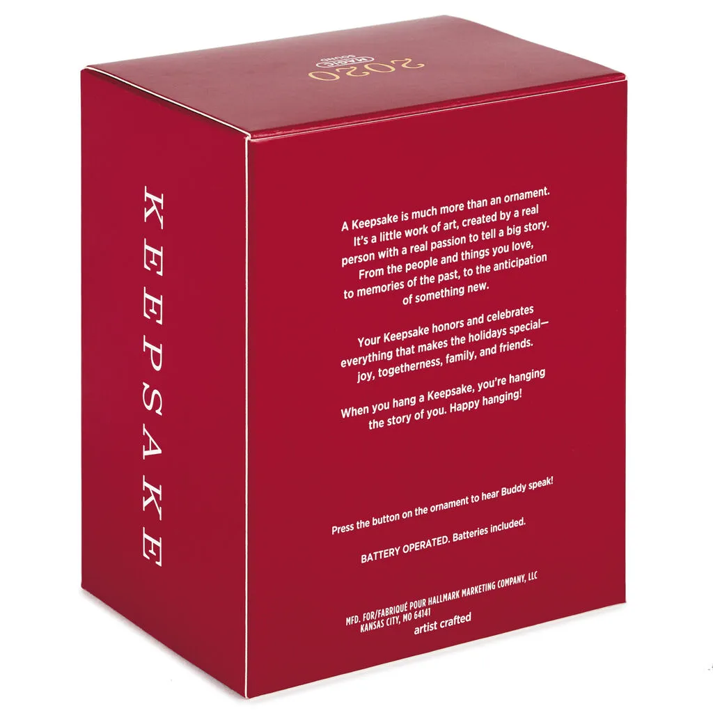 Condition: Mint Ornament in Damaged Box Growing up at the North Pole, Buddy the Elf led an extraordinary life of making toys with elves and befriending talking snowmen and animals—like Mr. Narwhal! Press the button on this Christmas tree ornament to reminisce about the hilarious holiday film and hear lines from the scene as Buddy sets out to find his biological father (battery-operated).