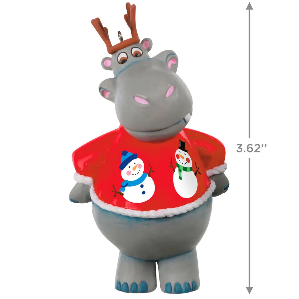 Serenade friends and family by playing “I Want a Hippopotamus for Christmas” with this whimsical Christmas tree ornament. Dressed in a festive snowman sweater and antler headband, this happy hippo is ready for her big debut on your tree. Press the button to hear part of the 1953 holiday classic performed by Gayla Peevey (battery-operated).