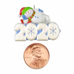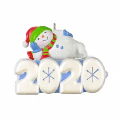 Welcome a cool new decade with this miniature Christmas tree ornament. The shimmering design features a glittery, bundled-up snowman relaxing atop snow-sculpted “2020” numbers that light up when you push the button (battery-operated).