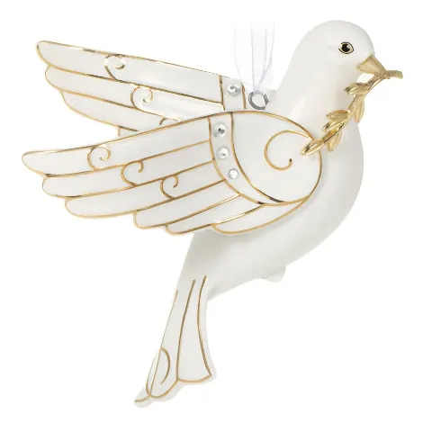 The most unifying wish of the giving season is that of peace to all on earth. That wish is granted with this premium porcelain Christmas tree ornament depicting a dove adorned with gem embellishments and carrying a metal branch in its beak. Inspired by the beloved Beauty of Birds series.