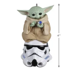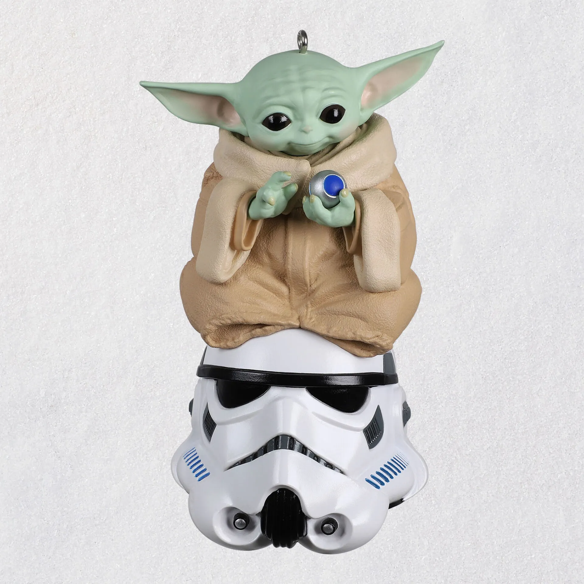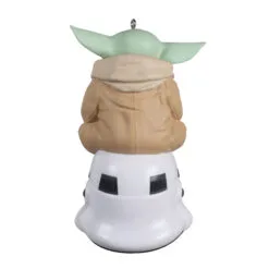The legend continues with The Child named Grogu (often called “Baby Yoda” by fans) from the Disney+ original series The Mandalorian. This Christmas tree ornament features the mysterious Force-sensitive alien playing with a shifter knob—from Din Djarin’s ship, The Razor Crest—as he sits atop a Stormtrooper helmet from remnants of the Galactic Empire.