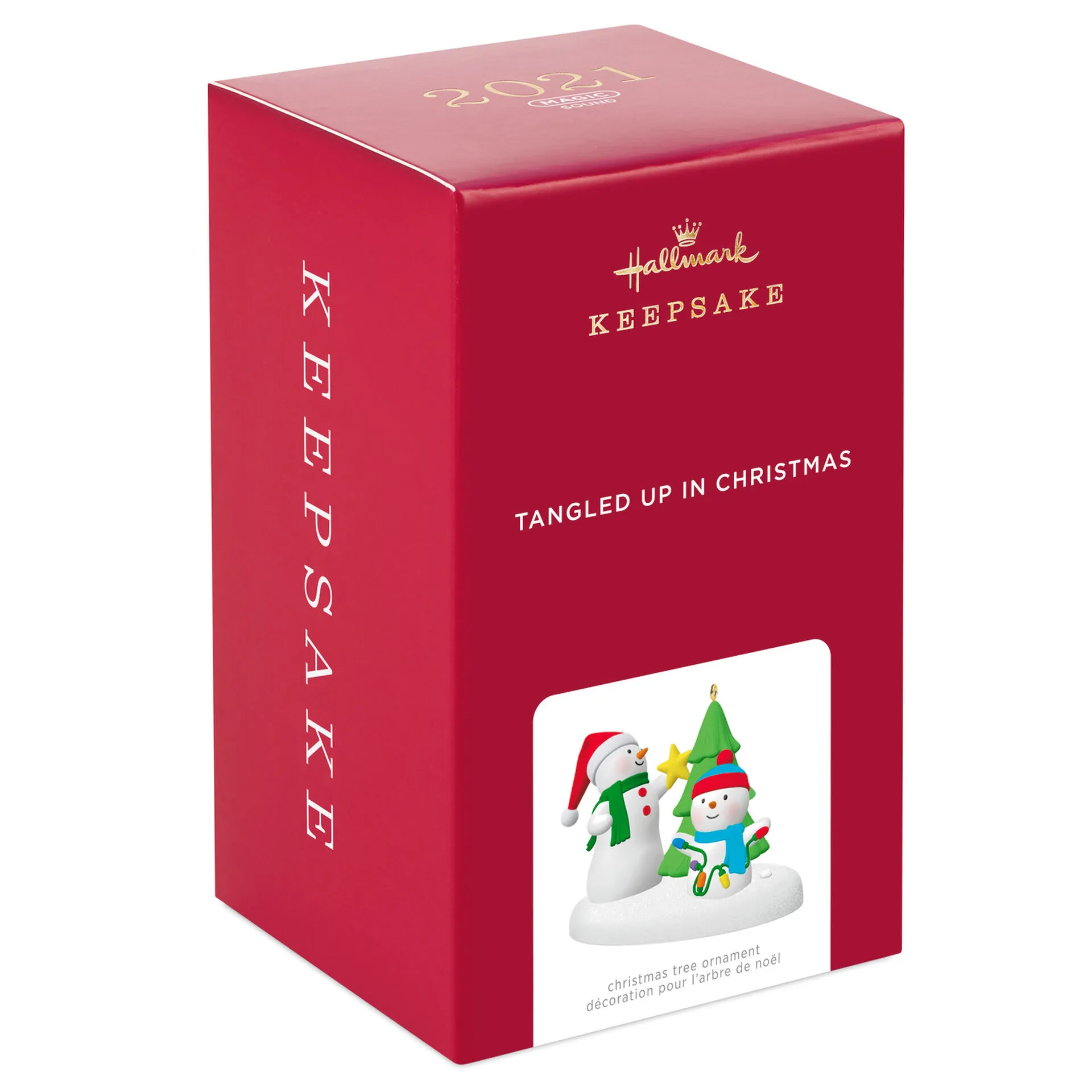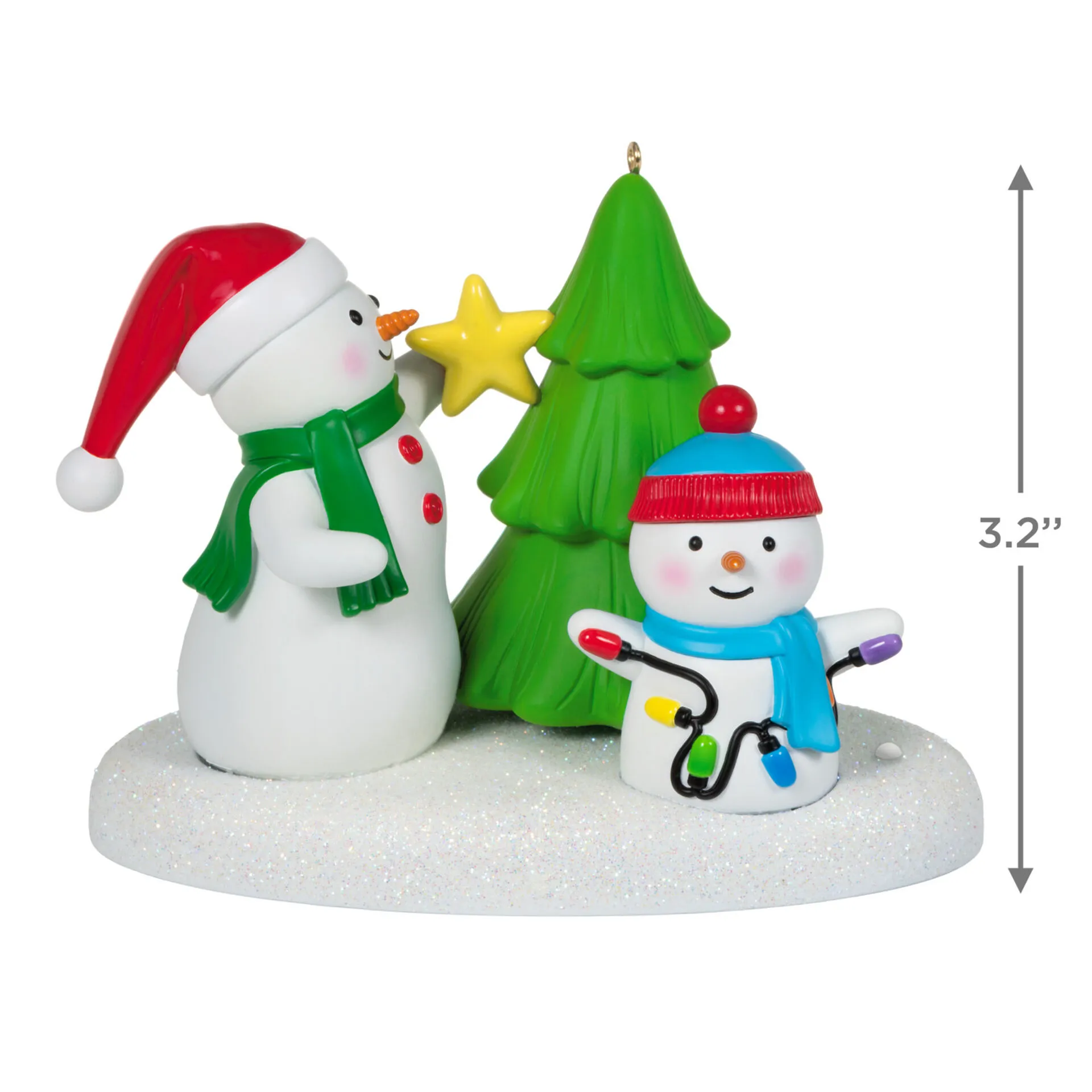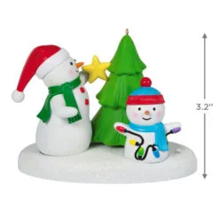 Capture the moments of the holiday season with this Christmas tree ornament featuring a pair of snowmen attempting to string lights on their fir tree. Wearing festive hats and scarves, these chilly cuties sing a lighthearted version of “O Christmas Tree” when you press the button (battery-operated). Coordinating singing snowman stuffed animal sold separately.