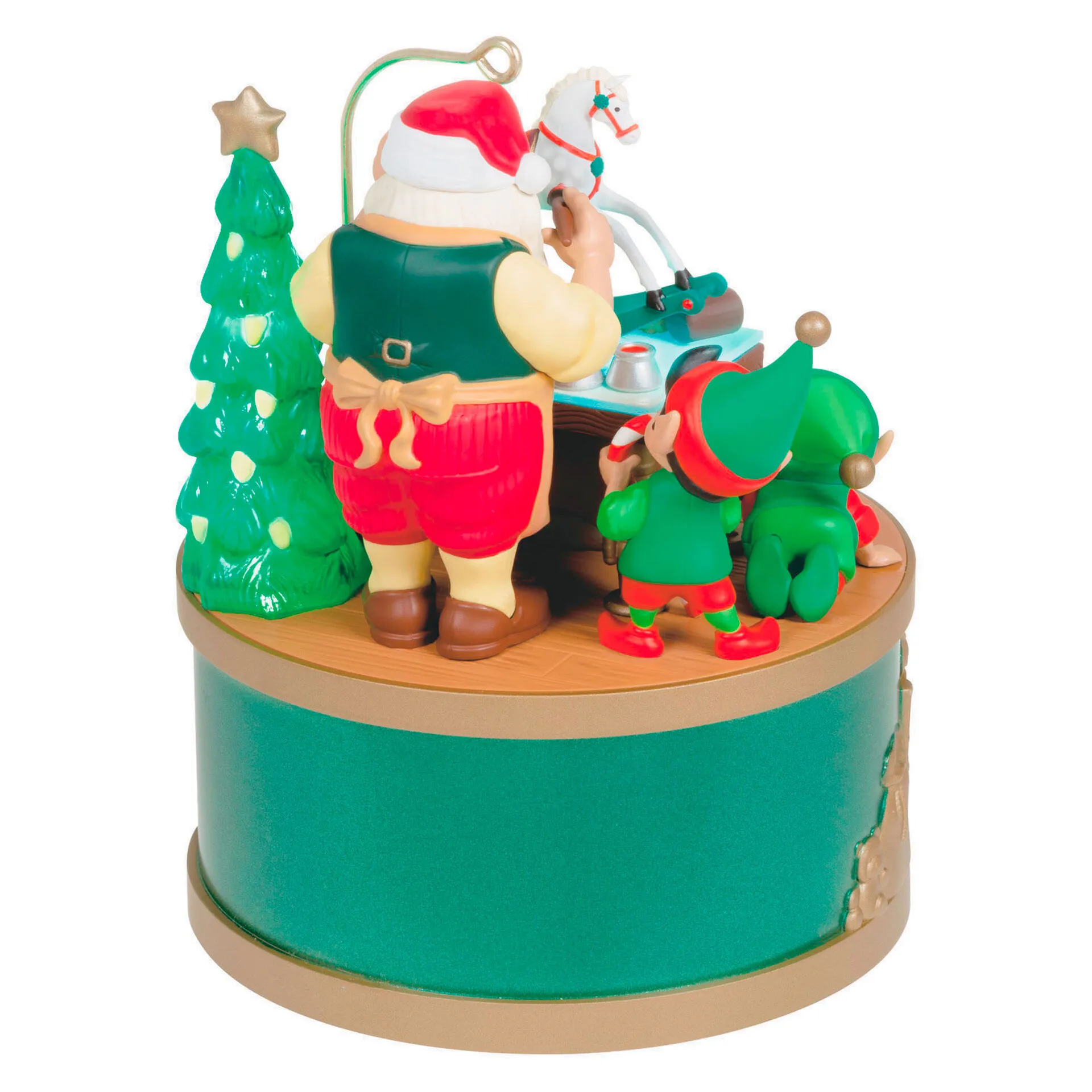 - Key Features: Press the button on the Magic Light, Sound and Motion ornament to see the ornament illuminate and watch Santa’s creations come to life to the tune of “Jolly Old St. Nicholas.”