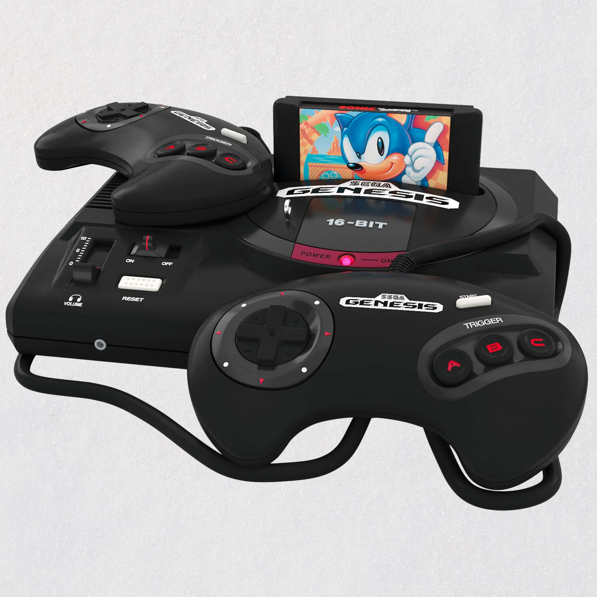Step back in time to afternoons spent with both hands wrapped around a SEGA video game controller, enjoying classic 16-bit gaming on your box TV. This SEGA Genesis console Christmas tree ornament has all the details you loved from the device that dominated the market, including two controllers and a classic “Sonic The Hedgehog” cartridge design, and features light and sounds from the iconic video game (battery-operated).