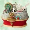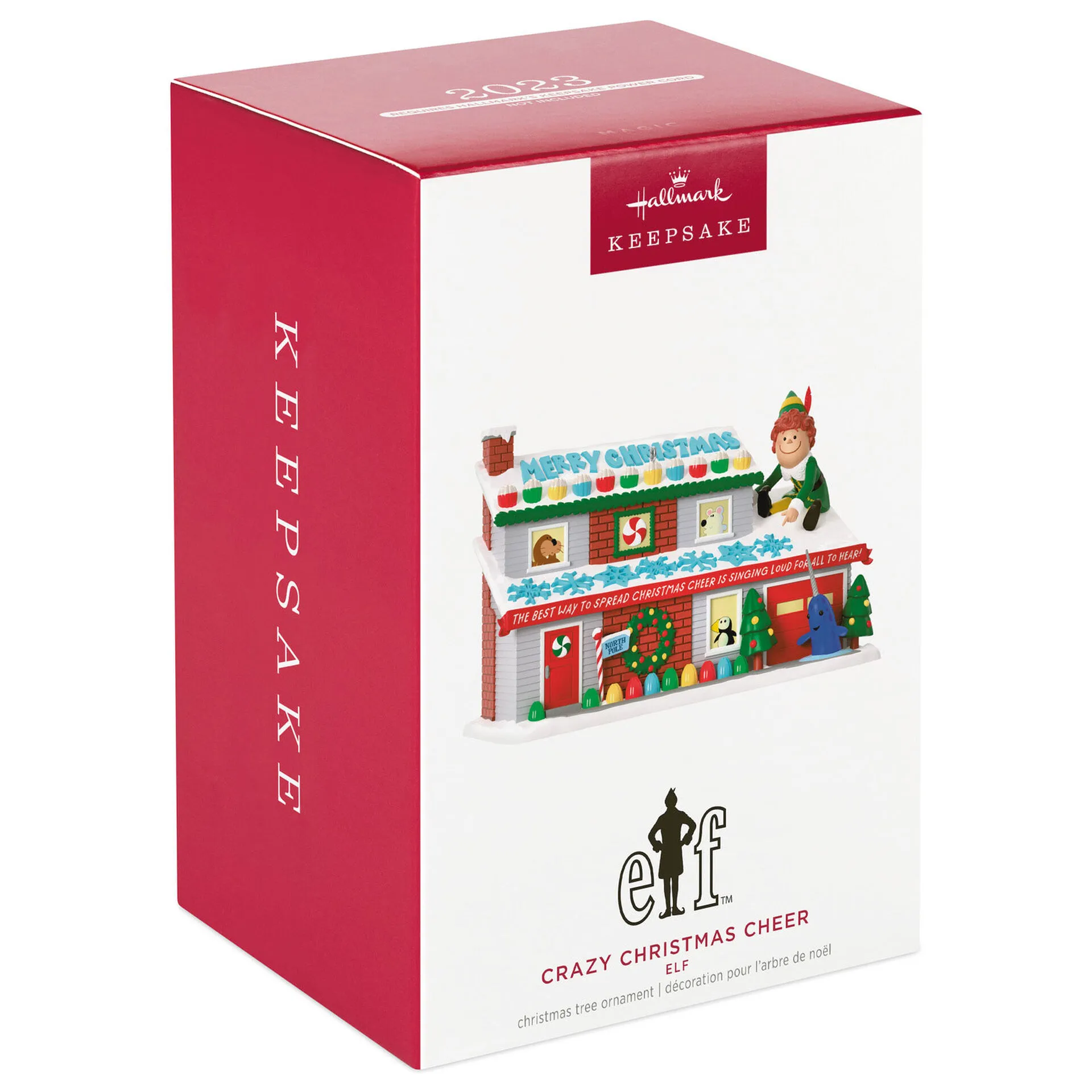 Bring an extra dose of cheer to your Christmas tree with this fun ornament. Buddy the Elf, Mr. Narwhal and other animal friends are gathered at this festively decorated house that boasts Christmas greetings on the roofs and an abundance of gumdrop-shaped lights. Connect it to Hallmark’s Keepsake Power Cord (sold separately) for continuous light effect. Press the button to see a synchronized sound and light show to the music from the opening score of the hilarious holiday movie “Elf.”