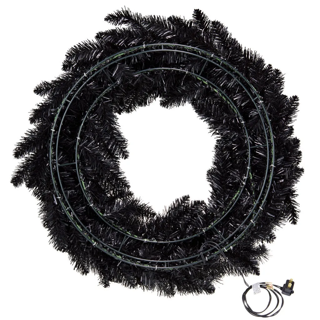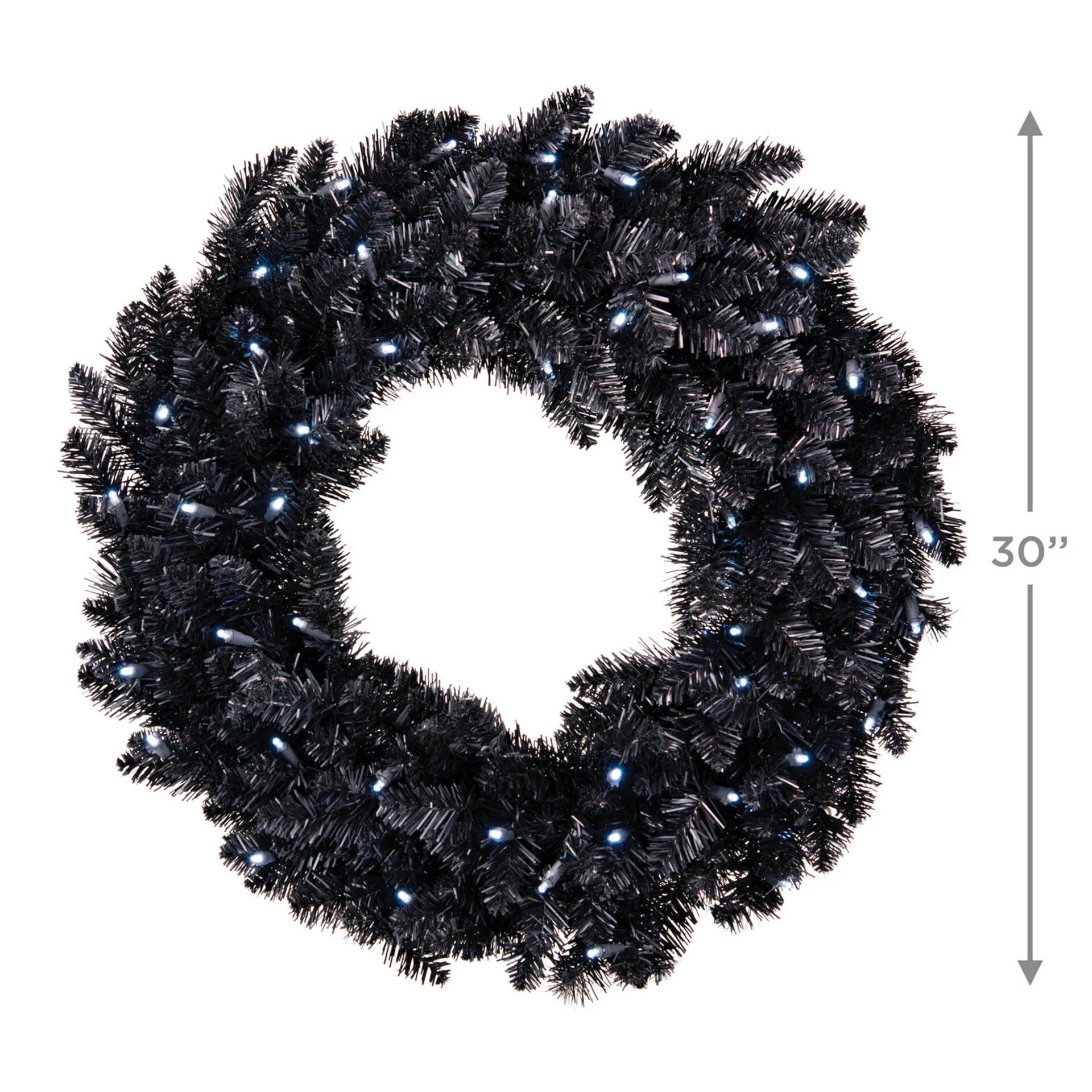 Display a galaxy of ornaments with this black pre-lit wreath. Bright white LED lights are perfect for highlighting your collection of sci-fi or Halloween Keepsake Ornaments. Simply plug into a standard 120-volt wall outlet to see the continuous light effect. For indoor use only.