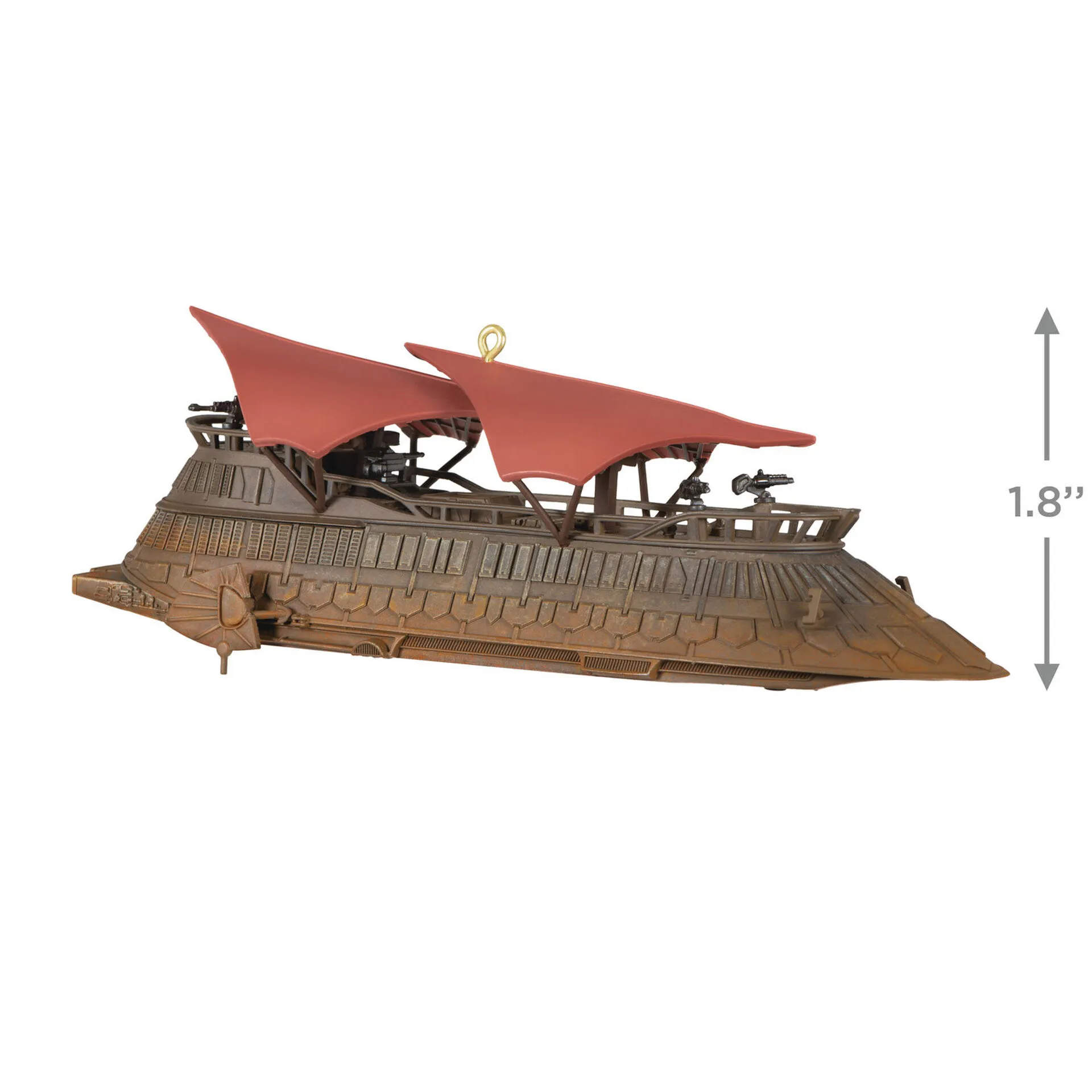 Jabba the Hutt used his luxury sail barge to visit Tatooine’s Sarlacc pit, where Han Solo, Luke Skywalker and Chewbacca were to be publicly executed. This Christmas tree ornament depicts that massive transport, the Khetanna, from Star Wars: Return of the Jedi. Press the button on the ornament to play audio from the unforgettable scene (battery-operated).