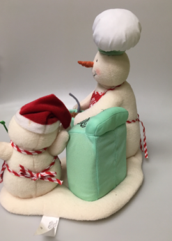 Press the button on the stove console and watch the snowman and snowman child sing and move to a fun rendition of “Jingle Bells.”